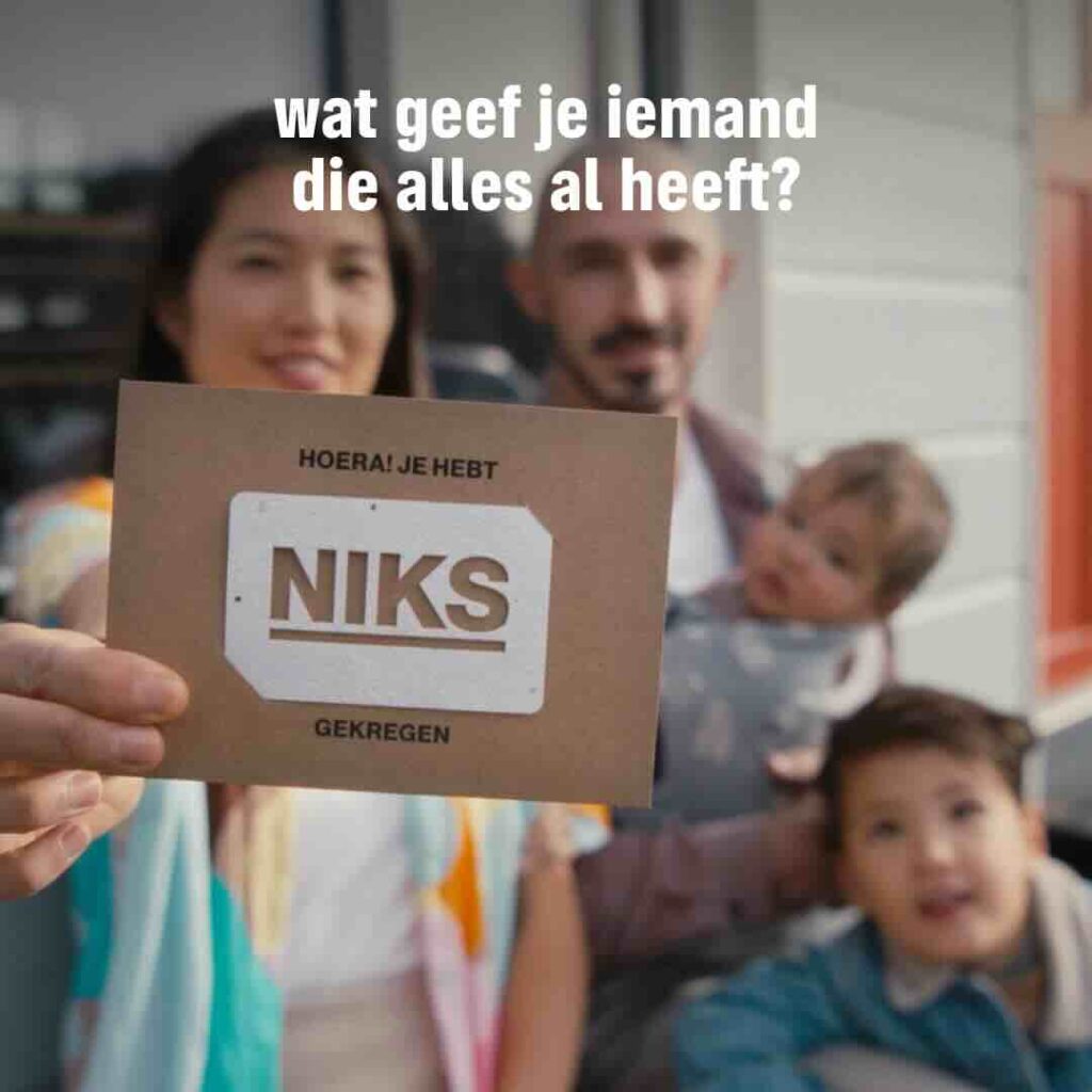 Er zijn al genoeg spullen. De wereld barst uit haar voegen. Wat geef je dan op een verjaardag, voor vaderdag, moederdag, kerst, Sinterklaas, of zomaar als bedankje? Juist: NIKS. Het meest duurzame cadeau. Met NIKS maak je altijd goede sier én steun je de strijd voor een gezonde natuur.